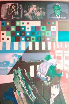 Eduardo Paolozzi’s prints merge popular culture and modern abstraction. Paolozzi was a forerunner to Pop Art and drew inspiration from popular sources in media, fine art, and modern abstraction of his day. The colorful portfolio General Dynamic F.U.N. (1980) includes an eclectic mix of imagery and abstract compositions appropriated from television and print advertisements. Similar to Andy Warhol’s screenprints that depict famous personalities and consumer products, the purposeful casualness of the iconic, Western representation of Jesus in the work Jesus colour by numbers from General Dynamic F.U.N. evokes the aesthetic of advertising.