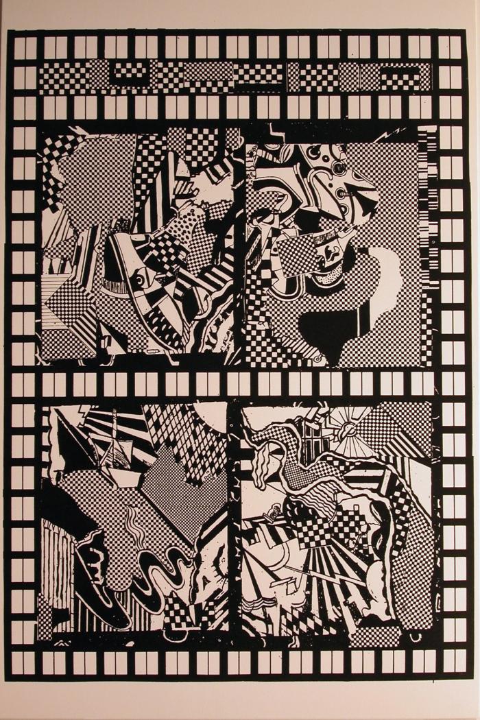 [A print in black and white. The entire border of the image shows a pattern of black and white squares. There is a checkered pattern throughout the background of the images. In the center, there are four squares of imagery. The composition of each is abstract, with a checkered background and various abstract imagery and patterning throughout.]