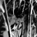[A black and white photograph of grass and/or plants taken from the side. A single praying mantis sits atop a plant in the middle of the image.]